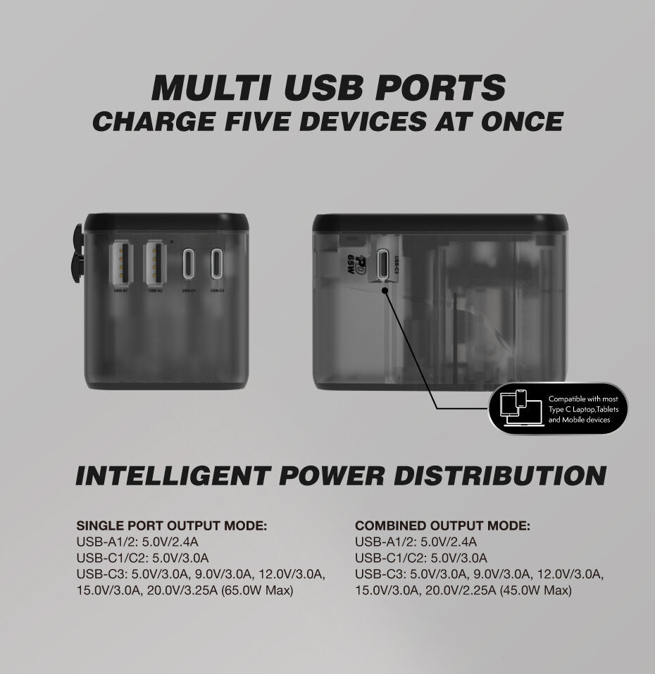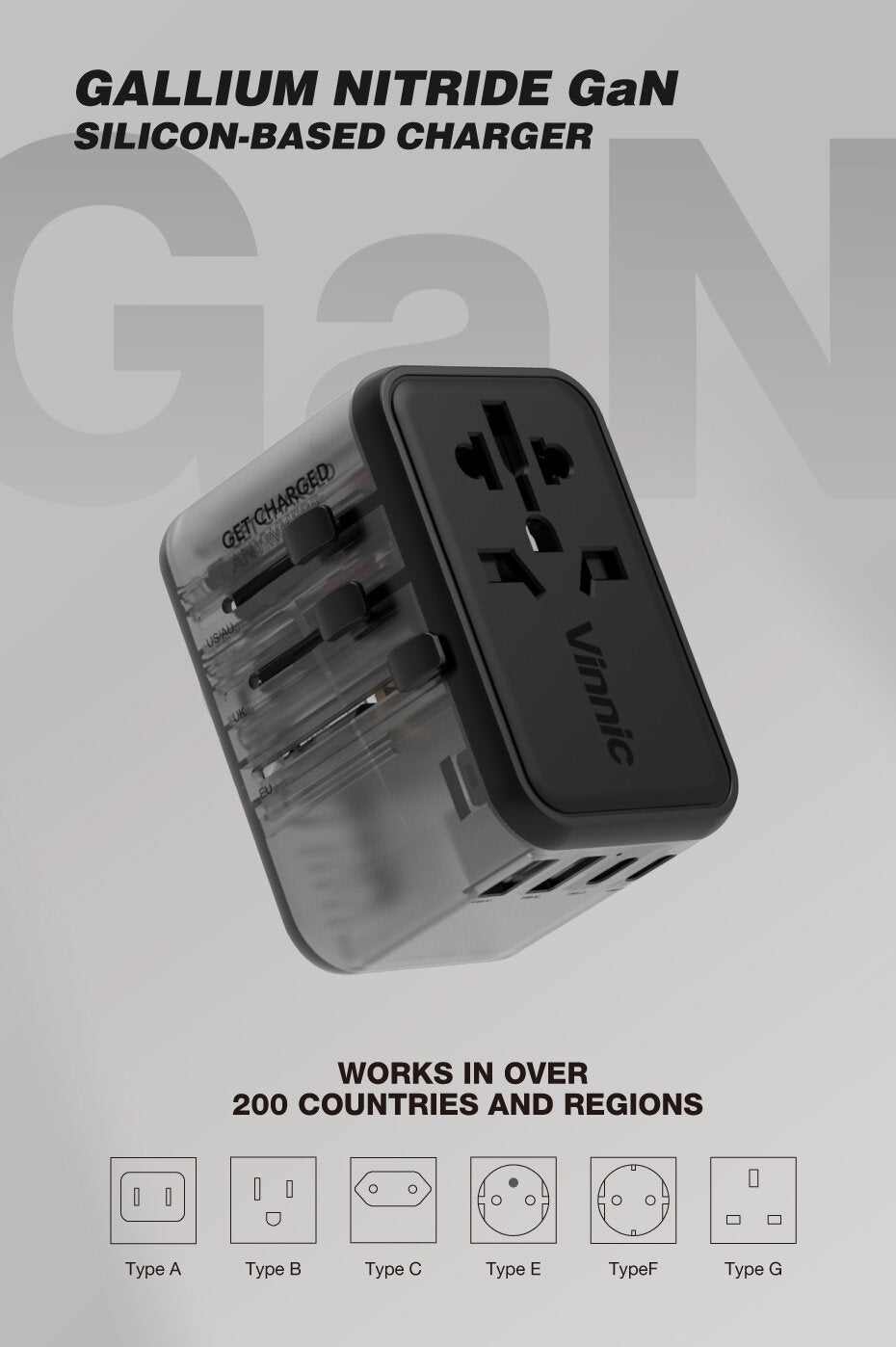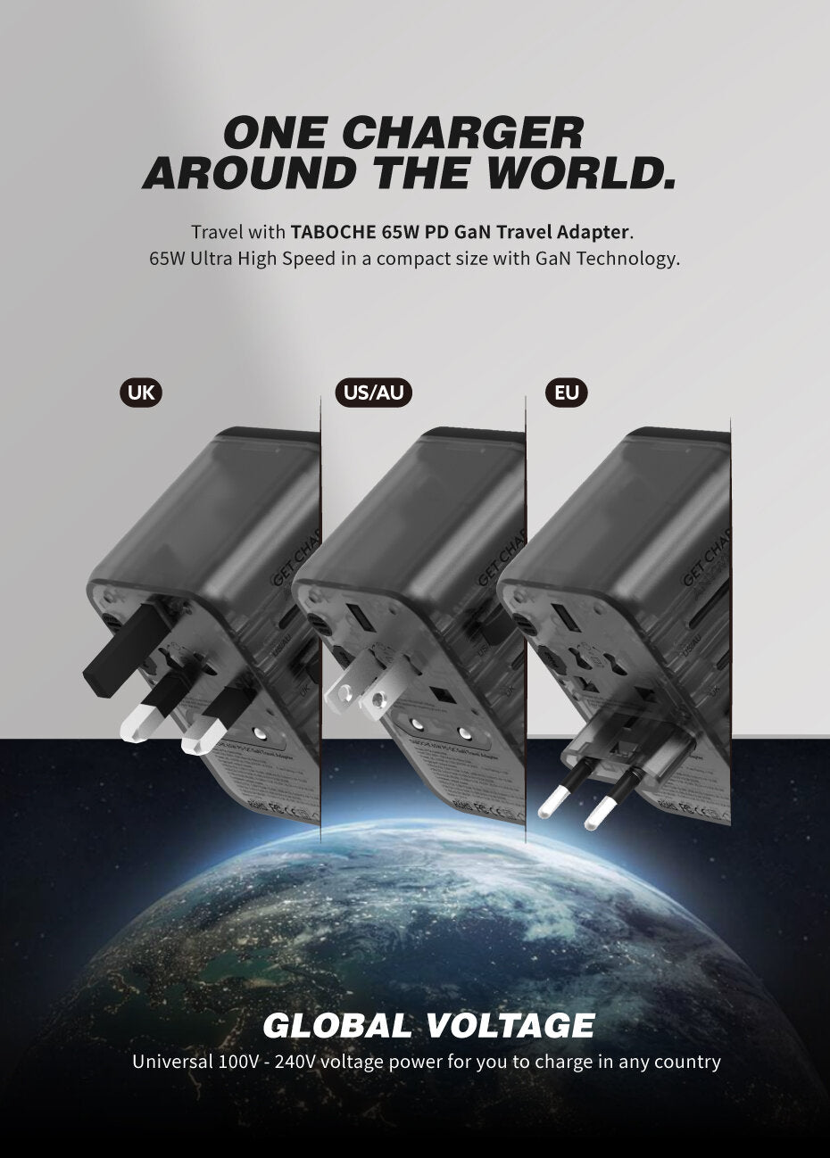帶著 Vinnic Taboche 65W PD GaN 旅行轉插器旅行。 Taboche 為您提供採用 GaN 技術的 65W 超高速。一個轉插器,環遊世界。
