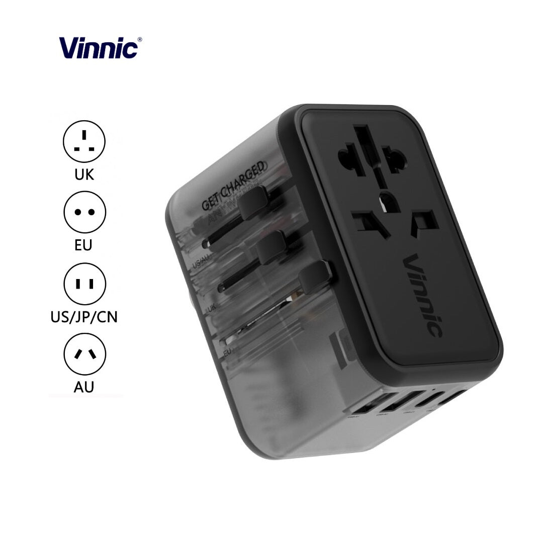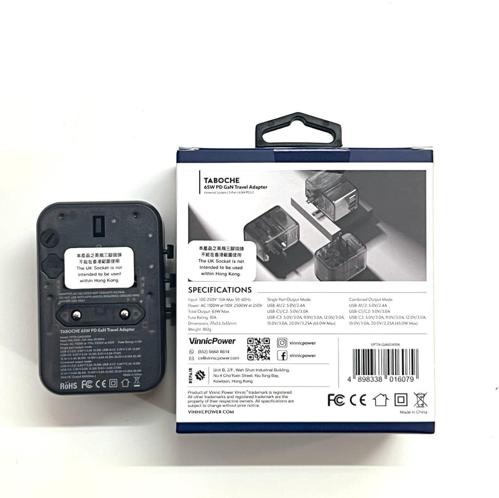 Vinnic 銀戰士電池 -【65W】PD GaN TABOCHE 多用途旅行轉換器 新款型格半透黑殼【VPTA-GA65WBK】
