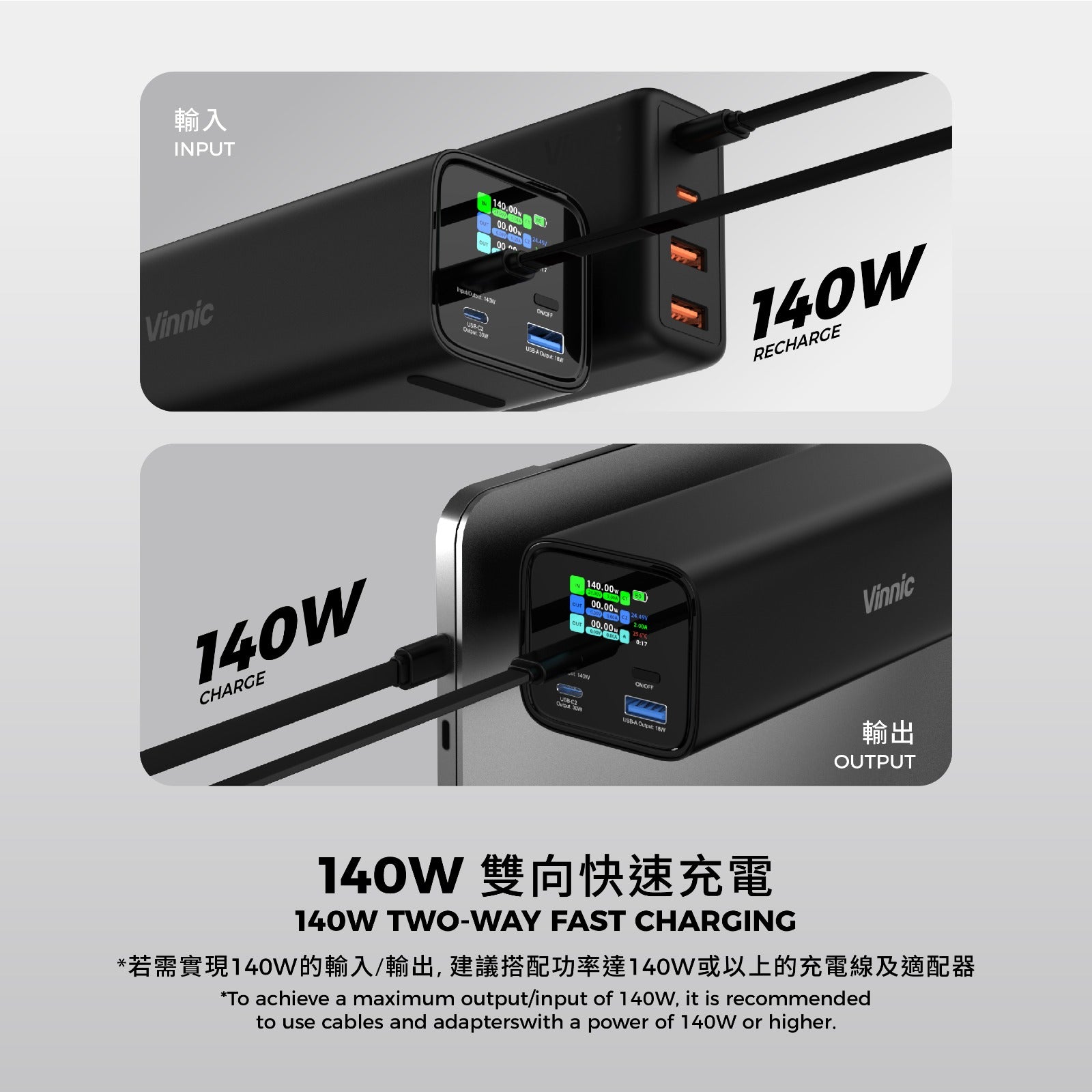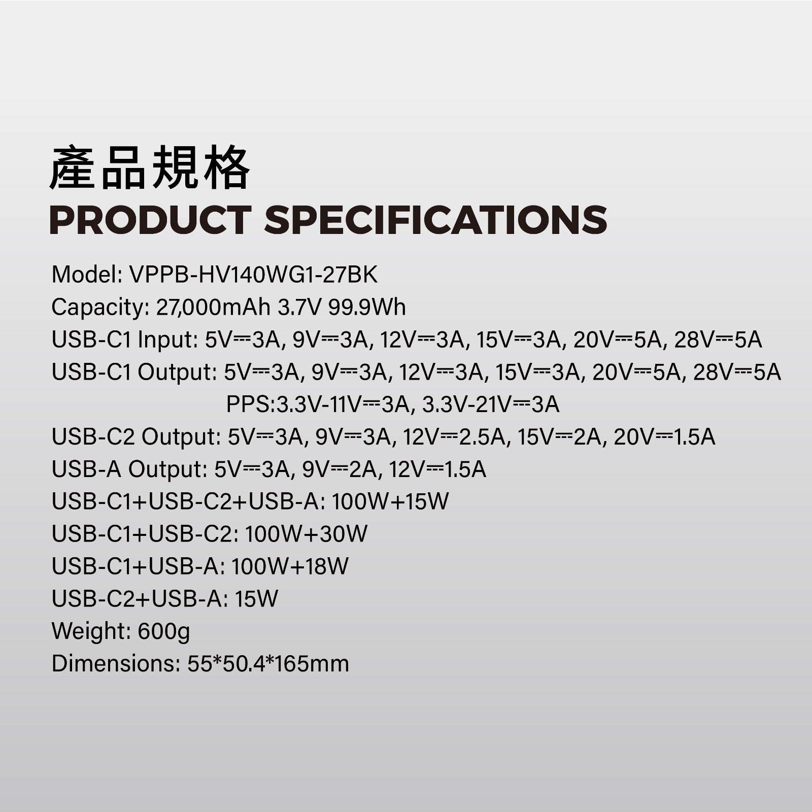 Vinnic 銀戰士電池 - 【HV140WG1-27BK】Mount Parker 2 140W PD3.1 27000mAh 行動電源 充電寶 - 為筆記型電腦和手機快速充電(可攜帶上飛機)